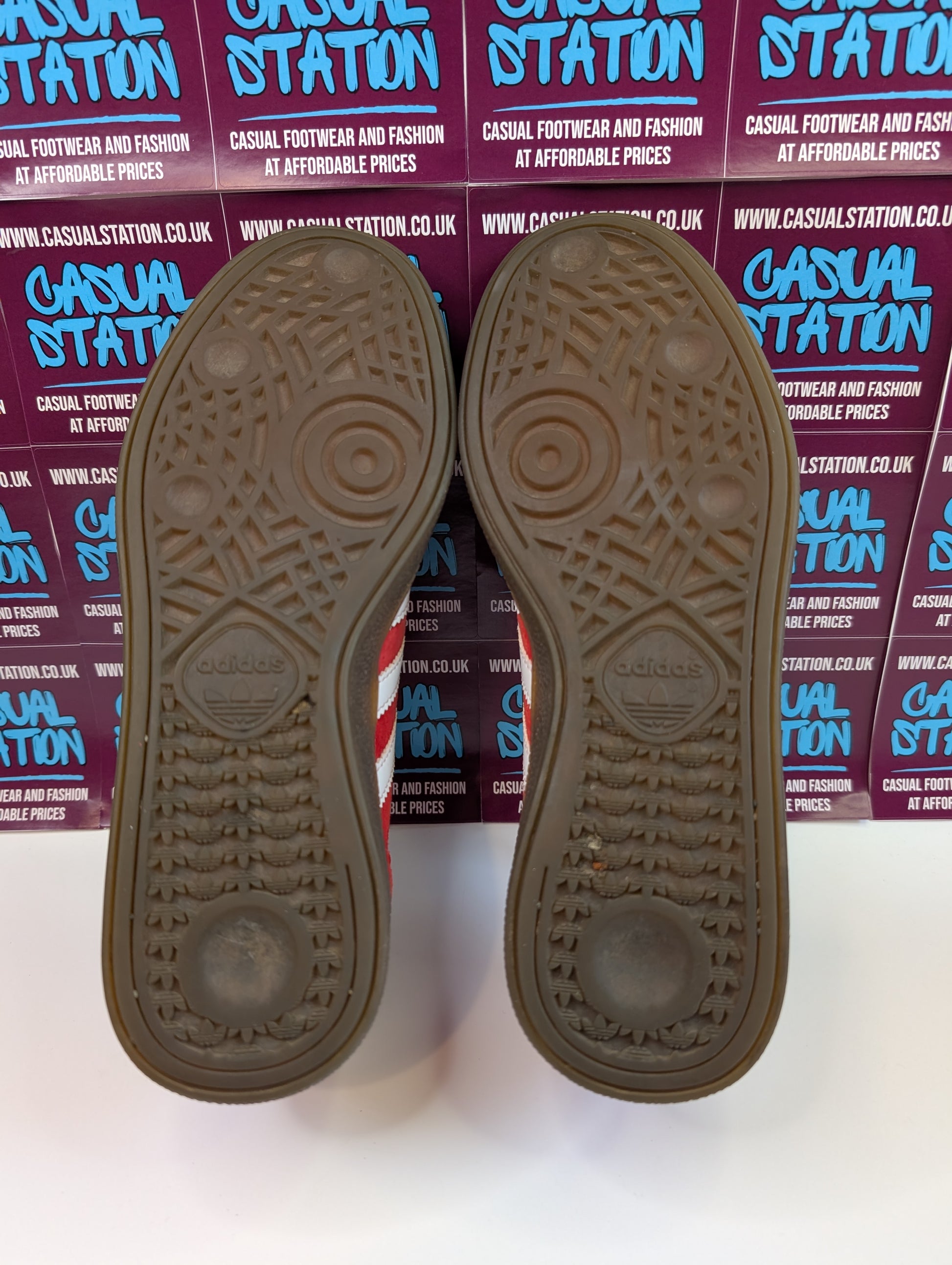 Pre-loved pair of Adidas Handball Spezial in red and white, size UK 5. The trainers are in decent condition with some signs of wear but no major flaws. Uppers, soles, and lining all have plenty of use left. A solid everyday pair with the classic Spezial look.