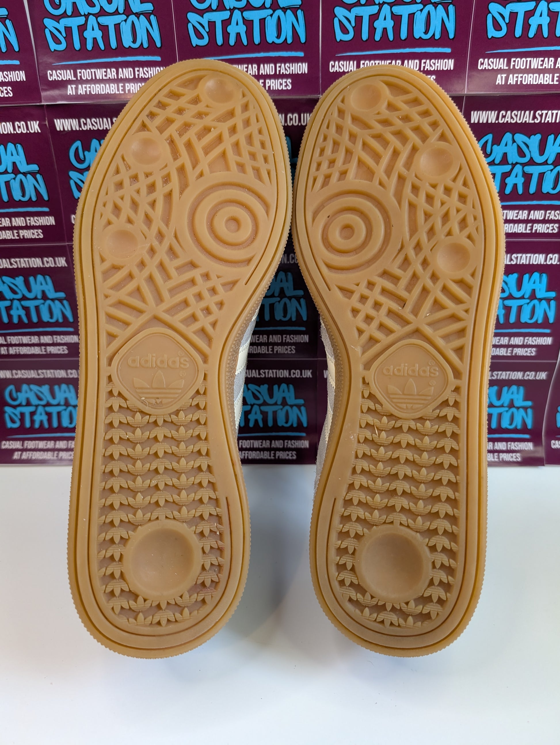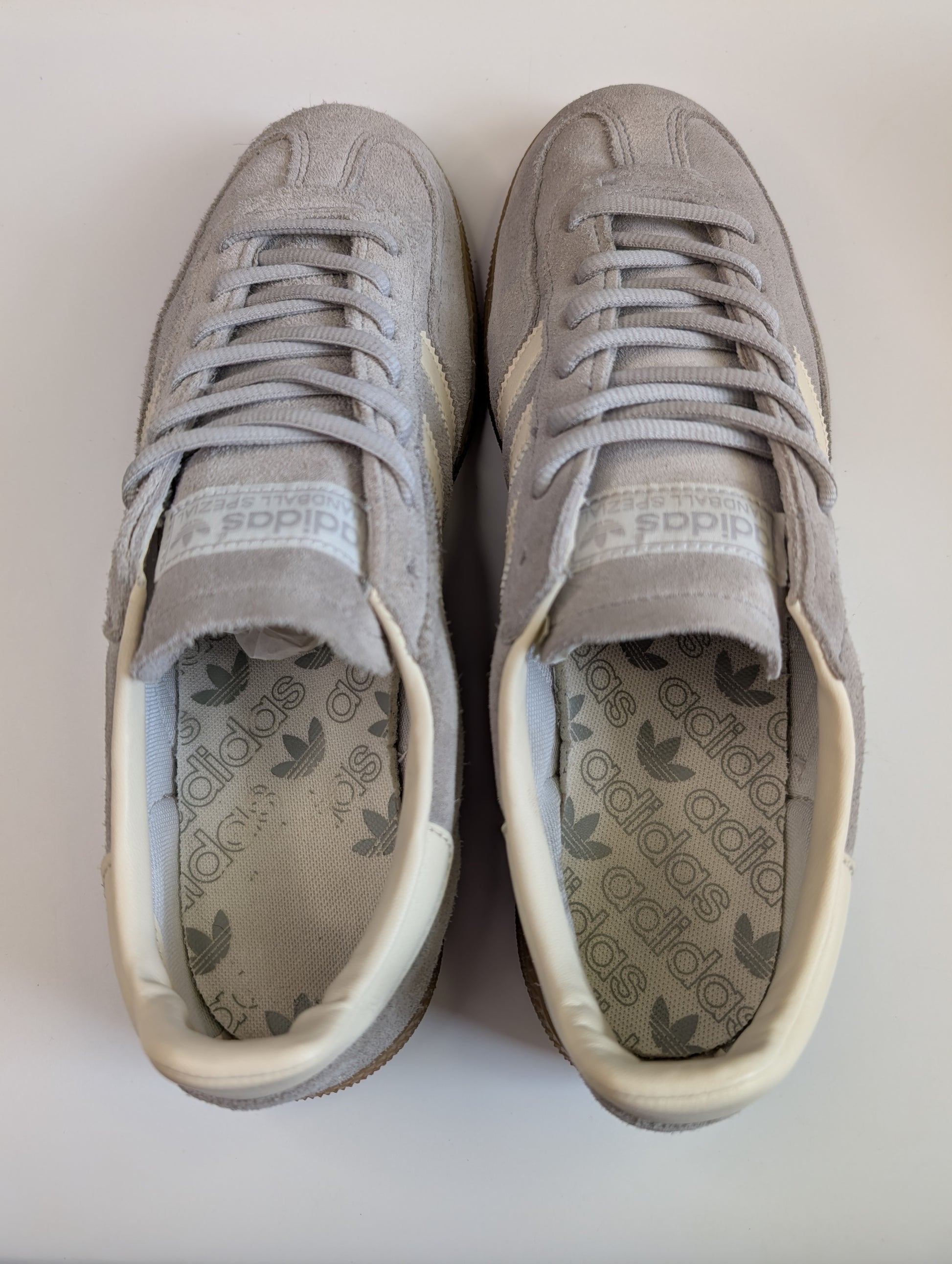 A classic pair of Adidas Handball Spezials in the popular light grey and white colourway. These trainers are pre-loved and still look great overall, with plenty of life left in them.