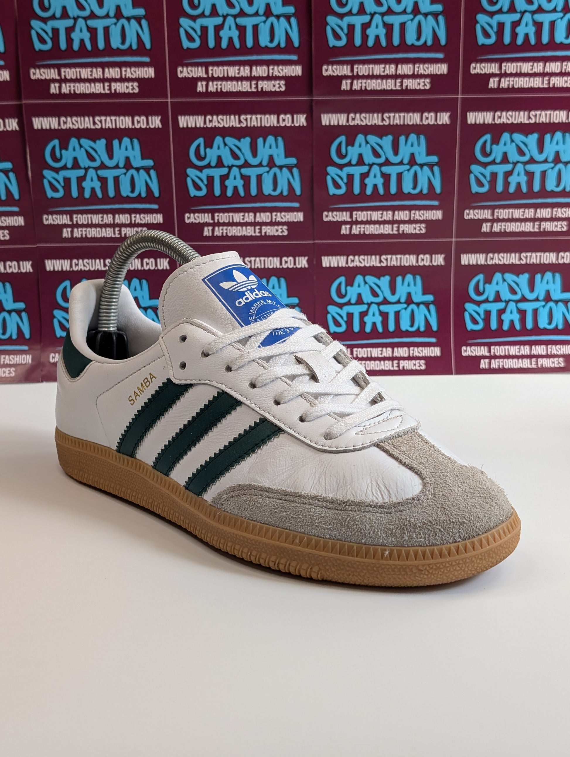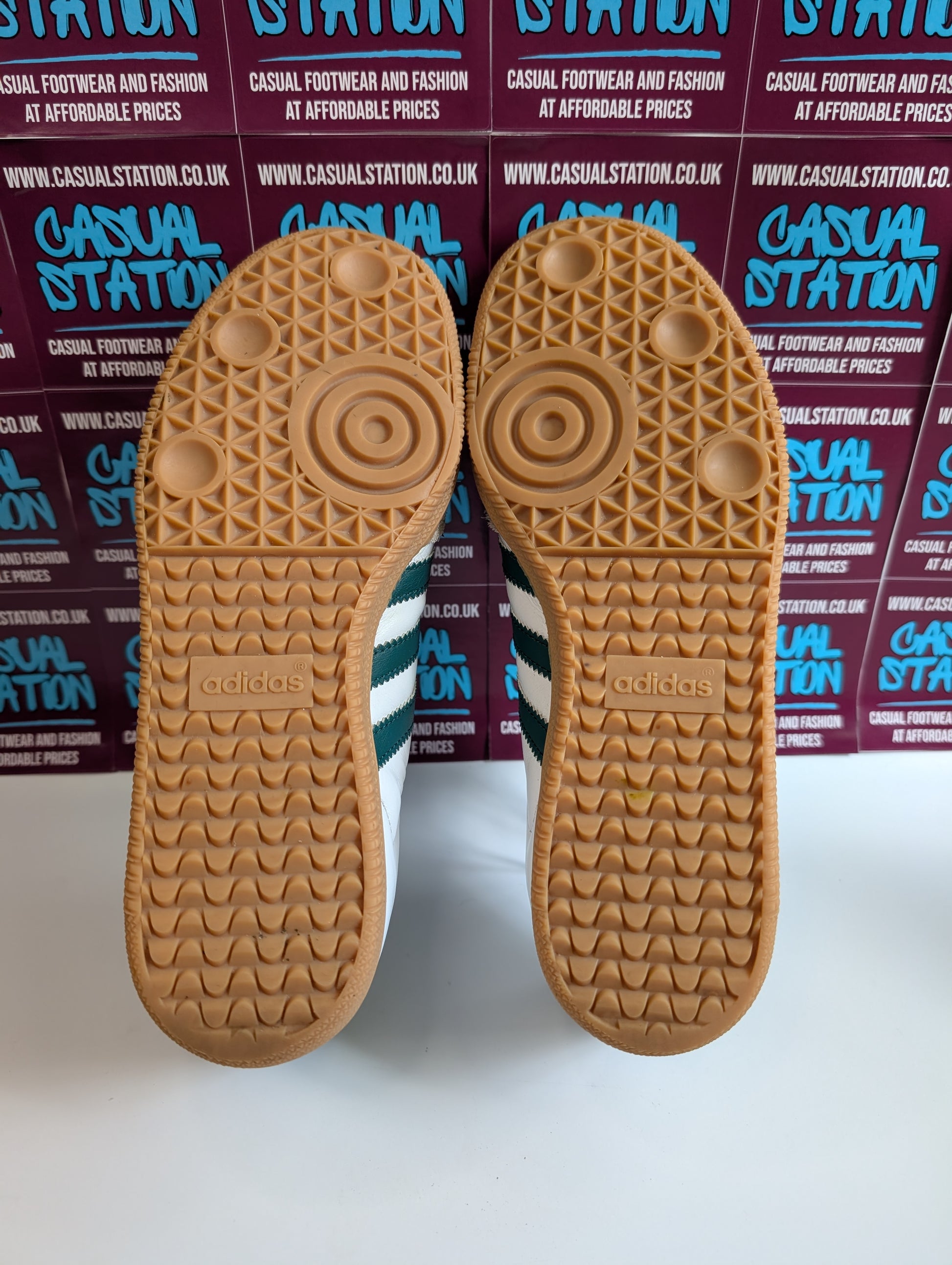 Classic Adidas Samba OG in white with dark green stripes. Pre-loved but still in great condition, with plenty of life left. Easy to wear and a great addition to any casual outfit.